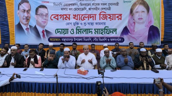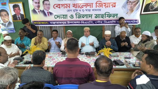 শাহীন আরাফাত শুভ :ব্রাহ্মণবাড়িয়ার বাঞ্ছারামপুরে সাবেক তিনবারের প্রধানমন্ত্রী ও বিএনপির চেয়ারপারসন বেগম খালেদা জিয়ার রোগমুক্তি ও দীর্ঘ সুস্থতা কামনায় বিশেষ দোয়া ও মিলাদ মাহফিল অনুষ্ঠিত হয়েছে। আজ বৃহস্পতিবার দুপুরে উপজেলা